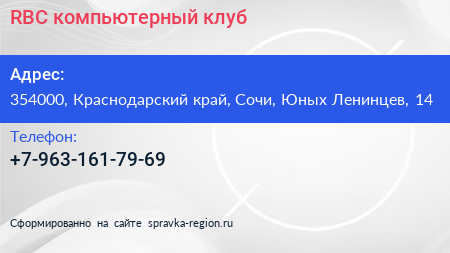 RBC, компьютерный клуб по адресу 354000, Краснодарский край, Сочи, Юных Ленинцев, 14 в дальнейшем Организация, размещена в следующих категориях: