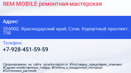 REM-MOBILE, ремонтная мастерская по адресу 354002, Краснодарский край, Сочи, Курортный проспект, 75Б в дальнейшем Организация, размещена в следующих категориях:
