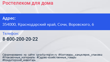 Ростелеком для дома по адресу 354000, Краснодарский край, Сочи, Воровского, 6 в дальнейшем Организация, размещена в следующих категориях: