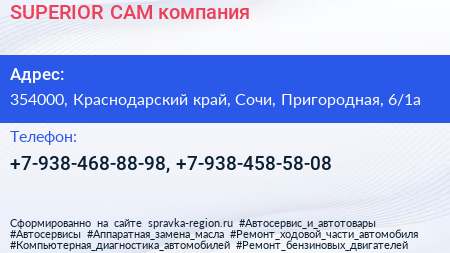 SUPERIOR CAM, компания по адресу 354000, Краснодарский край, Сочи, Пригородная, 6/1а в дальнейшем Организация, размещена в следующих категориях: