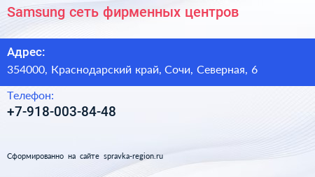 Samsung, сеть фирменных центров по адресу 354000, Краснодарский край, Сочи, Северная, 6 в дальнейшем Организация, размещена в следующих категориях: