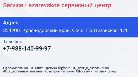 Service Lazarevskoe, сервисный центр по адресу 354200, Краснодарский край, Сочи, Партизанская, 1/1 в дальнейшем Организация, размещена в следующих категориях: