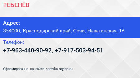 ТЕБЕНЁВ по адресу 354000, Краснодарский край, Сочи, Навагинская, 16 в дальнейшем Организация, размещена в следующих категориях: