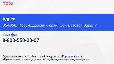 Yota по адресу 354068, Краснодарский край, Сочи, Новая Заря, 7 в дальнейшем Организация, размещена в следующих категориях: