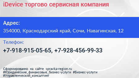 iDevice, торгово-сервисная компания по адресу 354000, Краснодарский край, Сочи, Навагинская, 12 в дальнейшем Организация, размещена в следующих категориях: