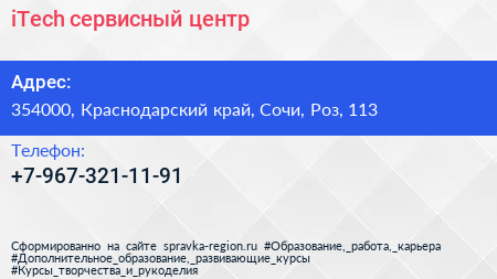 iTech, сервисный центр по адресу 354000, Краснодарский край, Сочи, Роз, 113 в дальнейшем Организация, размещена в следующих категориях: