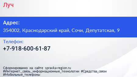 Луч по адресу 354002, Краснодарский край, Сочи, Депутатская, 9 в дальнейшем Организация, размещена в следующих категориях:
