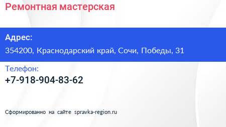 Ремонтная мастерская по адресу 354200, Краснодарский край, Сочи, Победы, 31 в дальнейшем Организация, размещена в следующих категориях:
