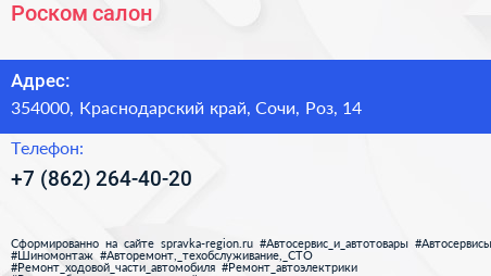 Роском, салон по адресу 354000, Краснодарский край, Сочи, Роз, 14 в дальнейшем Организация, размещена в следующих категориях: