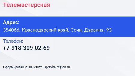 Телемастерская по адресу 354066, Краснодарский край, Сочи, Дарвина, 93 в дальнейшем Организация, размещена в следующих категориях: