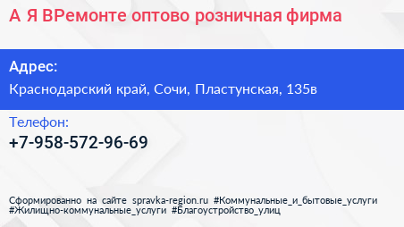 А-Я ВРемонте, оптово-розничная фирма по адресу Краснодарский край, Сочи, Пластунская, 135в в дальнейшем Организация, размещена в следующих категориях: