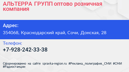 АЛЬТЕРРА ГРУПП, оптово-розничная компания по адресу 354068, Краснодарский край, Сочи, Донская, 28 в дальнейшем Организация, размещена в следующих категориях: