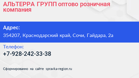АЛЬТЕРРА ГРУПП, оптово-розничная компания по адресу 354207, Краснодарский край, Сочи, Гайдара, 2а в дальнейшем Организация, размещена в следующих категориях: