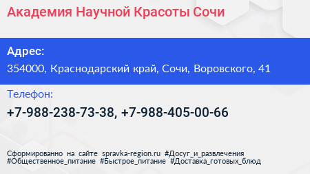 Академия Научной Красоты-Сочи по адресу 354000, Краснодарский край, Сочи, Воровского, 41 в дальнейшем Организация, размещена в следующих категориях: