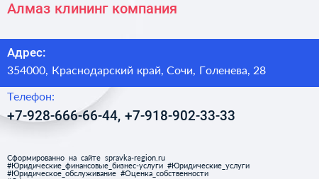 Алмаз-клининг, компания по адресу 354000, Краснодарский край, Сочи, Голенева, 28 в дальнейшем Организация, размещена в следующих категориях: