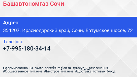 Башавтономгаз-Сочи по адресу 354207, Краснодарский край, Сочи, Батумское шоссе, 72 в дальнейшем Организация, размещена в следующих категориях: