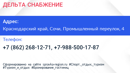 ДЕЛЬТА СНАБЖЕНИЕ по адресу Краснодарский край, Сочи, Промышленный переулок, 4 в дальнейшем Организация, размещена в следующих категориях: