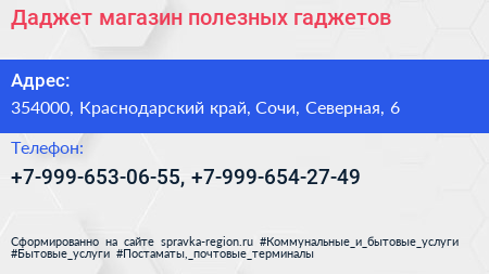 Даджет, магазин полезных гаджетов по адресу 354000, Краснодарский край, Сочи, Северная, 6 в дальнейшем Организация, размещена в следующих категориях: