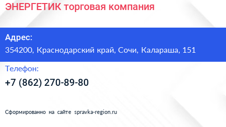 ЭНЕРГЕТИК, торговая компания по адресу 354200, Краснодарский край, Сочи, Калараша, 151 в дальнейшем Организация, размещена в следующих категориях: