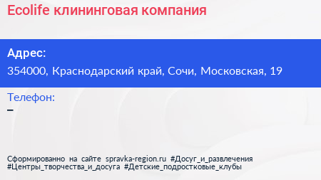Ecolife, клининговая компания по адресу 354000, Краснодарский край, Сочи, Московская, 19 в дальнейшем Организация, размещена в следующих категориях: