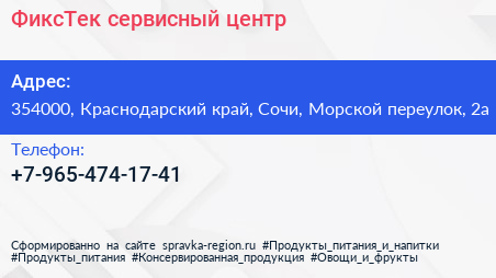 ФиксТек, сервисный центр по адресу 354000, Краснодарский край, Сочи, Морской переулок, 2а в дальнейшем Организация, размещена в следующих категориях: