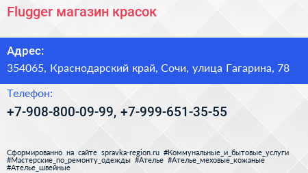 Flugger, магазин красок по адресу 354065, Краснодарский край, Сочи, улица Гагарина, 78 в дальнейшем Организация, размещена в следующих категориях: