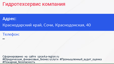 Гидротехсервис, компания по адресу Краснодарский край, Сочи, Краснодонская, 40 в дальнейшем Организация, размещена в следующих категориях: