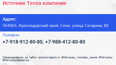 Источник Тепла, компания по адресу 354065, Краснодарский край, Сочи, улица Гагарина, 82 в дальнейшем Организация, размещена в следующих категориях: