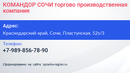 КОМАНДОР-СОЧИ, торгово-производственная компания по адресу Краснодарский край, Сочи, Пластунская, 52з/3 в дальнейшем Организация, размещена в следующих категориях: