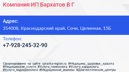 Компания, ИП Бархатов В.Г. по адресу 354008, Краснодарский край, Сочи, Целинная, 15Б в дальнейшем Организация, размещена в следующих категориях: