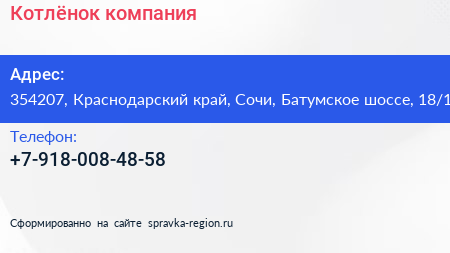 Котлёнок, компания по адресу 354207, Краснодарский край, Сочи, Батумское шоссе, 18/1 в дальнейшем Организация, размещена в следующих категориях: