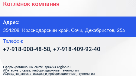 Котлёнок, компания по адресу 354208, Краснодарский край, Сочи, Декабристов, 25а в дальнейшем Организация, размещена в следующих категориях:
