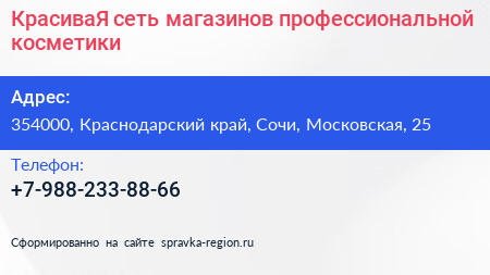 КрасиваЯ, сеть магазинов профессиональной косметики по адресу 354000, Краснодарский край, Сочи, Московская, 25 в дальнейшем Организация, размещена в следующих категориях: