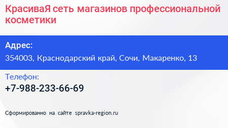 КрасиваЯ, сеть магазинов профессиональной косметики по адресу 354003, Краснодарский край, Сочи, Макаренко, 13 в дальнейшем Организация, размещена в следующих категориях: