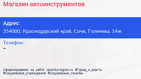 Магазин автоинструментов по адресу 354000, Краснодарский край, Сочи, Голенева, 14ж в дальнейшем Организация, размещена в следующих категориях: