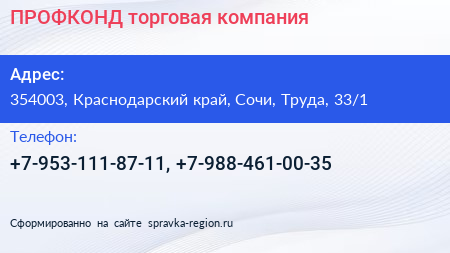 ПРОФКОНД, торговая компания по адресу 354003, Краснодарский край, Сочи, Труда, 33/1 в дальнейшем Организация, размещена в следующих категориях: