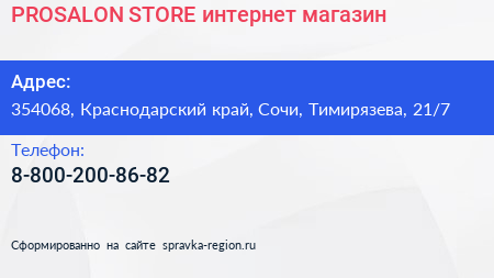 PROSALON-STORE, интернет-магазин по адресу 354068, Краснодарский край, Сочи, Тимирязева, 21/7 в дальнейшем Организация, размещена в следующих категориях: