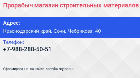 Прорабыч, магазин строительных материалов по адресу Краснодарский край, Сочи, Чебрикова, 40 в дальнейшем Организация, размещена в следующих категориях: