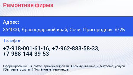 Ремонтная фирма по адресу 354000, Краснодарский край, Сочи, Пригородная, 6/2Б в дальнейшем Организация, размещена в следующих категориях: