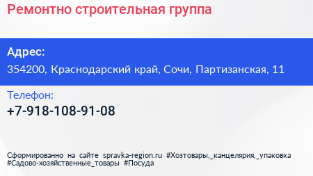 Ремонтно-строительная группа по адресу 354200, Краснодарский край, Сочи, Партизанская, 11 в дальнейшем Организация, размещена в следующих категориях: