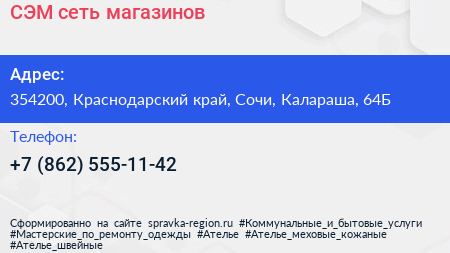 СЭМ, сеть магазинов по адресу 354200, Краснодарский край, Сочи, Калараша, 64Б в дальнейшем Организация, размещена в следующих категориях: