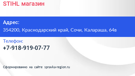 STIHL, магазин по адресу 354200, Краснодарский край, Сочи, Калараша, 64в в дальнейшем Организация, размещена в следующих категориях: