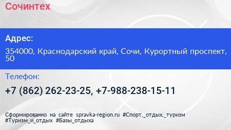 Сочинтех по адресу 354000, Краснодарский край, Сочи, Курортный проспект, 50 в дальнейшем Организация, размещена в следующих категориях: