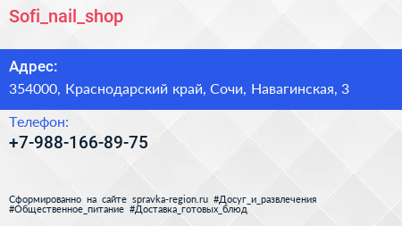 Sofi_nail_shop по адресу 354000, Краснодарский край, Сочи, Навагинская, 3 в дальнейшем Организация, размещена в следующих категориях: