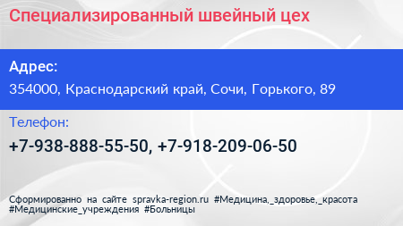 Специализированный швейный цех по адресу 354000, Краснодарский край, Сочи, Горького, 89 в дальнейшем Организация, размещена в следующих категориях: