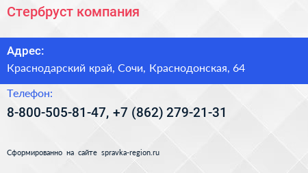 Стербруст, компания по адресу Краснодарский край, Сочи, Краснодонская, 64 в дальнейшем Организация, размещена в следующих категориях: