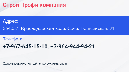 Строй Профи, компания по адресу 354057, Краснодарский край, Сочи, Туапсинская, 21 в дальнейшем Организация, размещена в следующих категориях: