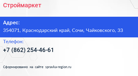 Строймаркет по адресу 354071, Краснодарский край, Сочи, Чайковского, 33 в дальнейшем Организация, размещена в следующих категориях:
