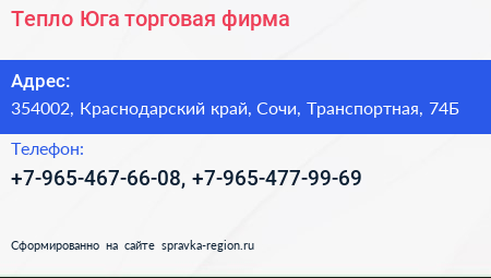 Тепло Юга, торговая фирма по адресу 354002, Краснодарский край, Сочи, Транспортная, 74Б в дальнейшем Организация, размещена в следующих категориях: