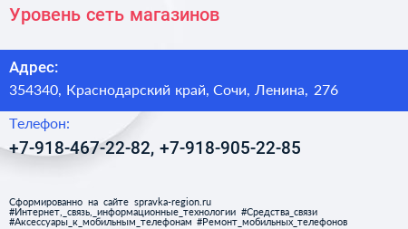 Уровень, сеть магазинов по адресу 354340, Краснодарский край, Сочи, Ленина, 276 в дальнейшем Организация, размещена в следующих категориях: